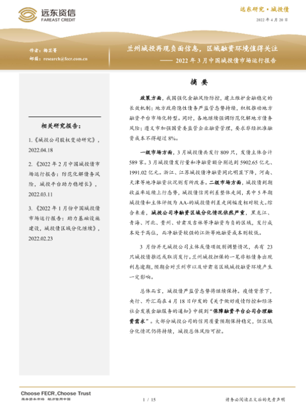 【远东资信】【20220420】2022年3月中国城投债市场运行报告:兰州城投再现负面信息,区域融资环境值得关注-15页 行业研究