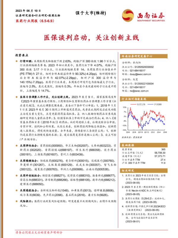 【西南证券】【20230610】医药行业周报:医保谈判启动,关注创新主线-38页 行业研究