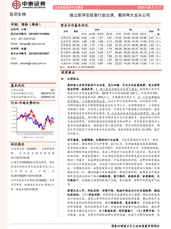 【中泰证券】【20190811】医药生物行业周报:独立医学实验室行业出清,看好两大龙头公司-8页 行业研究