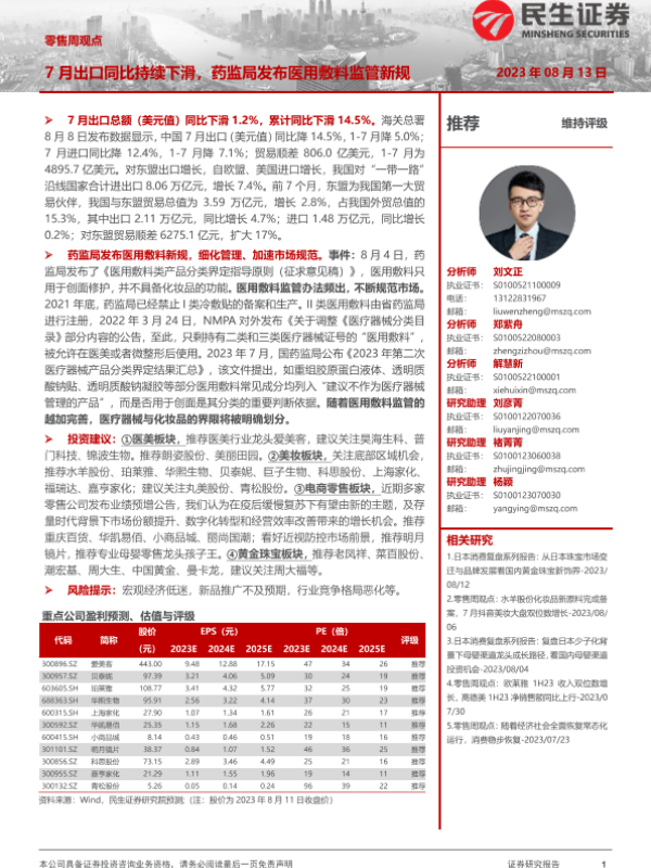 【民生证券】【20230813】零售周观点:7月出口同比持续下滑,药监局发布医用敷料监管新规-17页 行业研究
