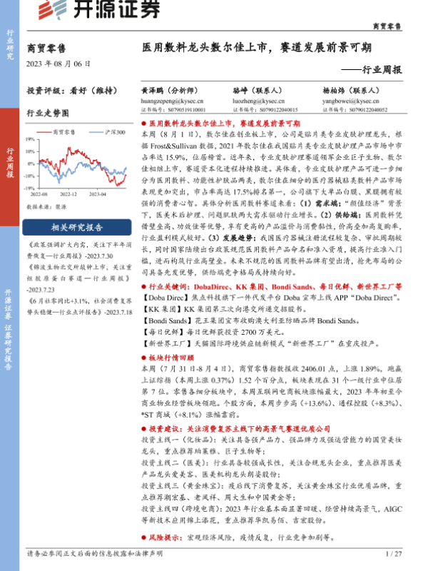 【开源证券】【20230806】商贸零售行业周报:医用敷料龙头敷尔佳上市,赛道发展前景可期-27页 行业研究