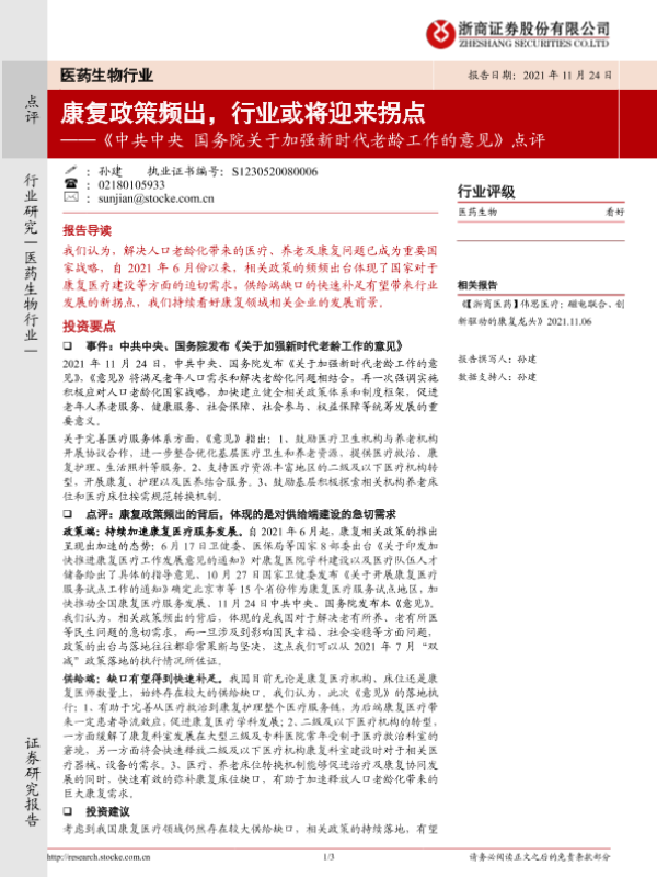 【浙商证券】【20211124】医药生物行业:《中共中央国务院关于加强新时代老龄工作的意见》点评-3页 行业研究