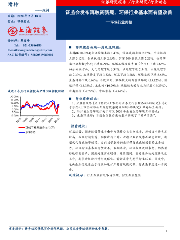 【上海证券】【20200218】环保行业周报:证监会发布再融资新规,环保行业基本面有望改善-6页 行业研究