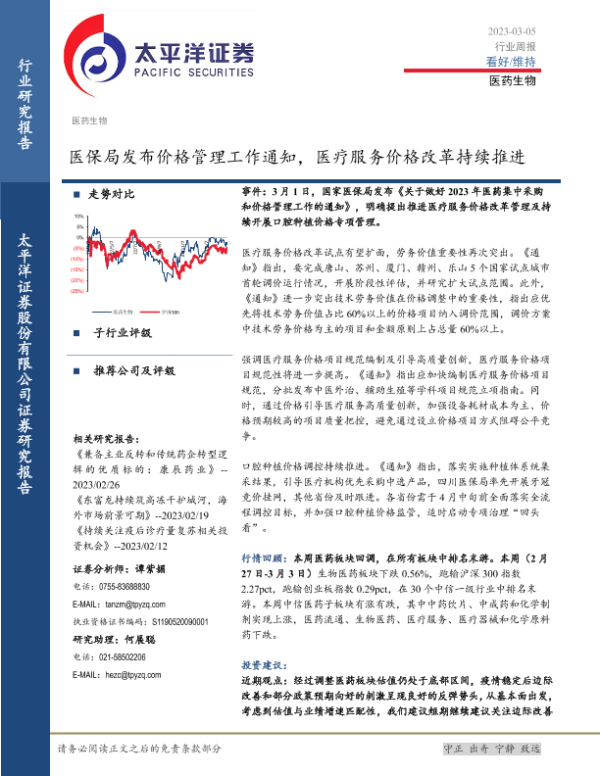 【太平洋证券】【20230305】医药生物行业周报:医保局发布价格管理工作通知,医疗服务价格改革持续推进-14页 行业研究