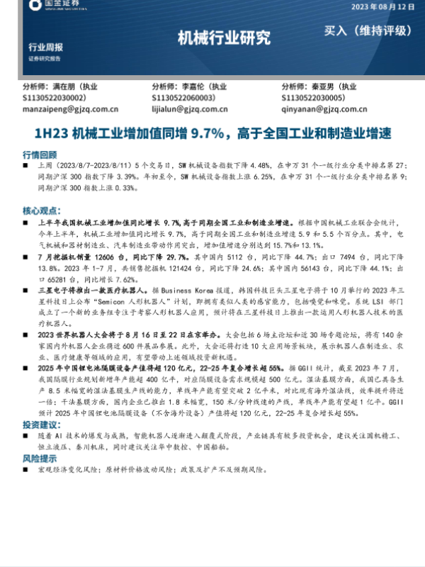 【国金证券】【20230812】20230812-国金证券-机械行业研究:1H23机械工业增加值同增9.7%,高于全国工业和制造业增速-16页 行业研究