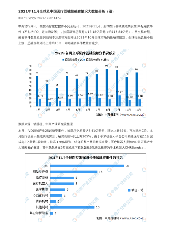 【中商产业研究院】【20211202】2021年11月全球及中国医疗器械投融资情况大数据分析-2页 行业研究