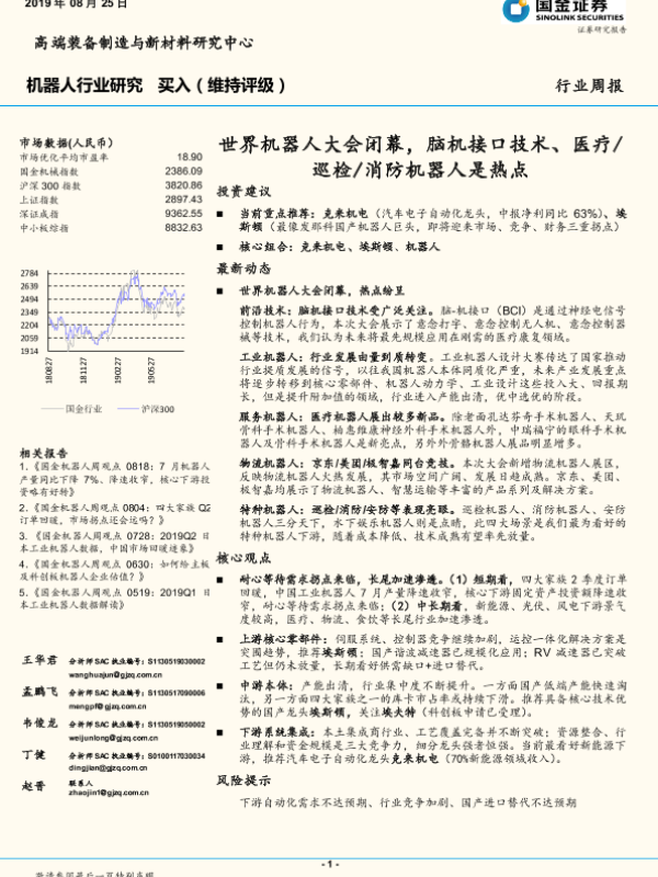 【国金证券】【20190825】20190825-国金证券-机器人行业研究:世界机器人大会闭幕,脑机接口技术、医疗 巡检 消防机器人是热点-14页 行业研究