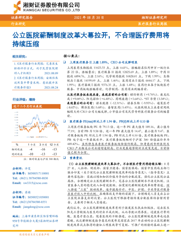 【湘财证券】【20210830】医疗服务行业周报:公立医院薪酬制度改革大幕拉开,不合理医疗费用将持续压缩-10页 行业研究