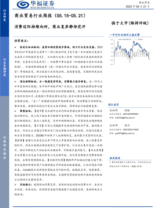 【华福证券】【20230521】商业贸易行业周报:消费边际持续向好,商业复苏静待花开-6页 行业研究
