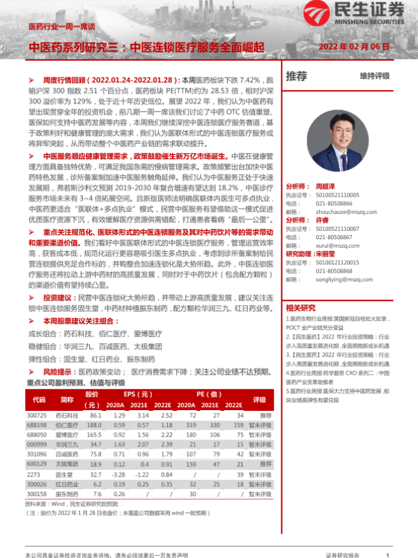 【民生证券】【20220206】医药行业一周一席谈:中医药系列研究三:中医连锁医疗服务全面崛起-11页 行业研究
