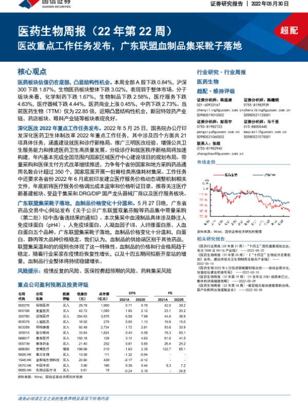 【国信证券】【20220530】医药生物周报:医改重点工作任务发布,广东联盟血制品集采靴子落地-14页 行业研究