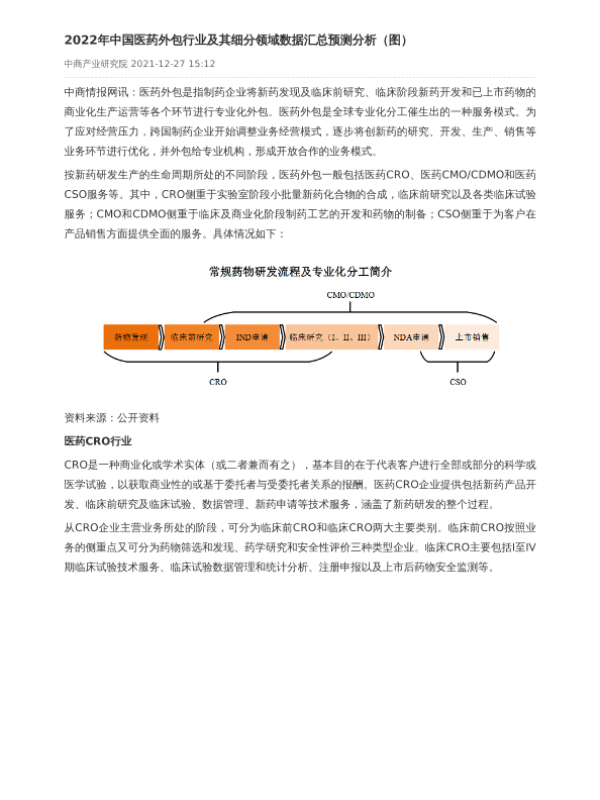 【中商产业研究院】【20211227】2022年中国医药外包行业及其细分领域数据汇总预测分析-5页 行业研究