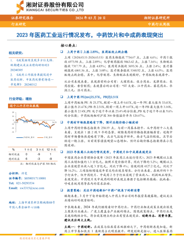 【湘财证券】【20240320】2023年医药工业运行情况发布,中药饮片和中成药表现突出-12页 行业研究