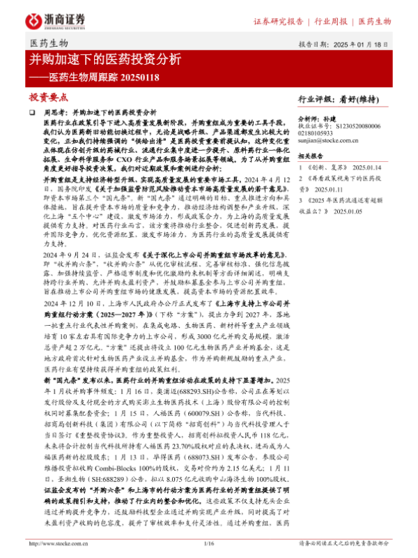 【浙商证券】【20250118】医药生物周跟踪:并购加速下的医药投资分析-16页 行业研究
