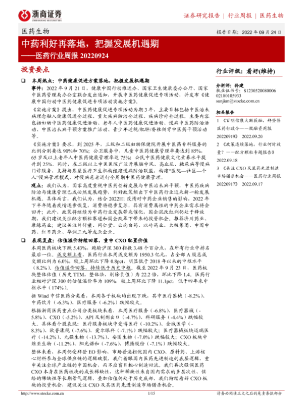 【浙商证券】【20220924】20220924-浙商证券-医药行业周报:中药利好再落地,把握发展机遇期-15页 行业研究