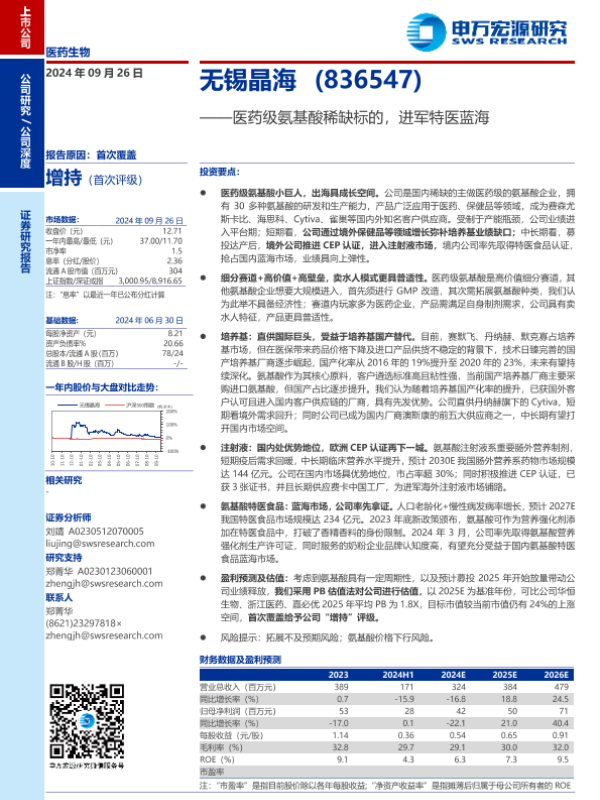 【申万宏源】【20240926】无锡晶海(836547)医药级氨基酸稀缺标的,进军特医蓝海-30页 行业研究