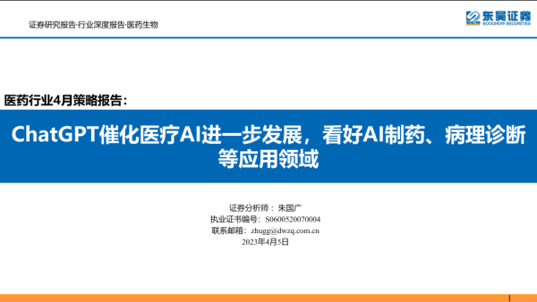 【东吴证券】【20230405】医药行业4月策略报告:ChatGPT催化医疗AI进一步发展,看好AI制药、病理诊断等应用领域-49页 行业研究