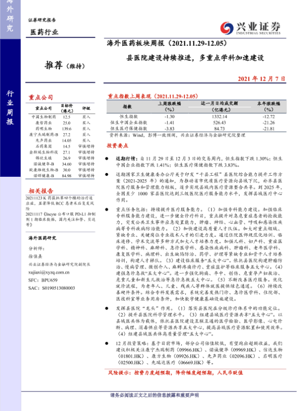 【兴业证券】【20211207】海外医药板块周报:县医院建设持续推进,多重点学科加速建设-15页 行业研究