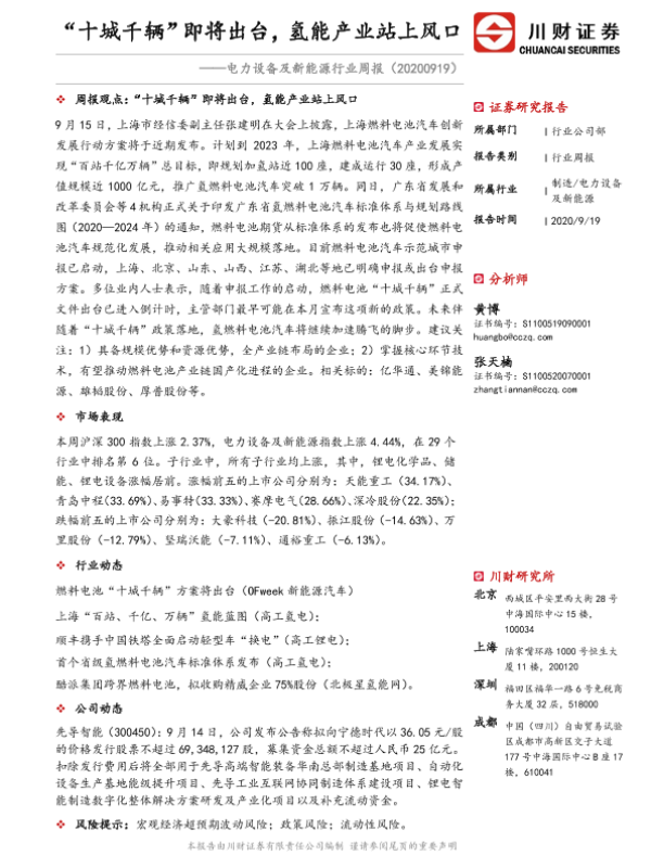【川财证券】【20200919】电力设备及新能源行业周报:“十城千辆”即将出台,氢能产业站上风口-16页 行业研究