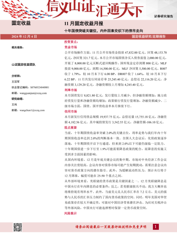 【山西证券】【20241204】11月固定收益月报:十年国债突破关键位,内外因素交织下的债市走向-15页 行业研究