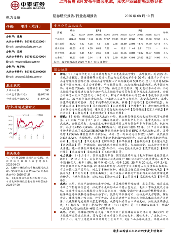 【中泰证券】【20250810】上汽名爵MG4发布半固态电池,光伏产业链价格走势分化-16页 证券期货研究报告