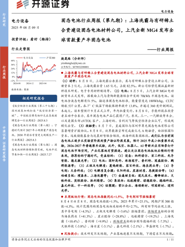 【开源证券】【20250809】上汽-MG4发布全球首款量产半固态电池-固态电池行业周报(第九期)-11页 证券期货研究报告