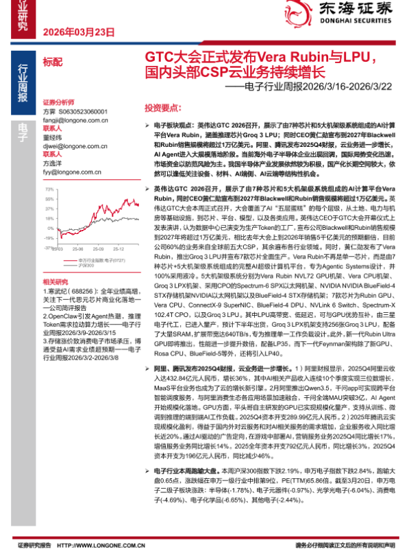 【东海证券】【202603】GTC大会正式发布Vera Rubin与 LPU,国内头部CSP云业务持续增长——电子行业周报2026/3/16-2026/3/22-15页 证券期货研究报告