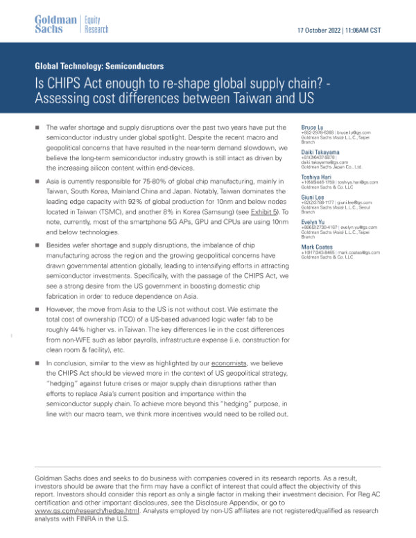 【Goldman Sachs】【20221017】Is CHIPS Act enough to re-shape global supply chain?-Assessing cost differences between Taiwan and US-26页 行业研究