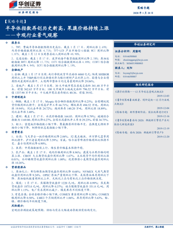 【华创证券】【20200120】策略专题:中观行业景气观察,半导体指数再创历史新高,果蔬价格持续上涨-26页 行业研究