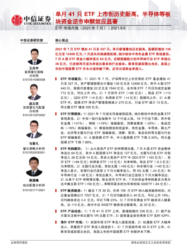 【中信证券】【20210806】ETF市场月报(2021年7月):单月41只ETF上市创历史新高,半导体等板块资金逆市申赎效应显著-24页 行业研究