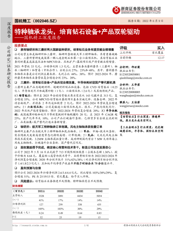 【浙商证券】【20220609】国机精工深度报告:特种轴承龙头,培育钻石设备+产品双轮驱动-41页 行业研究