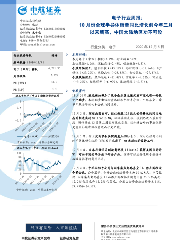 【中航证券】【20201205】电子行业周报:10月份全球半导体销量同比增长创今年三月以来新高-4页 证券期货研究报告