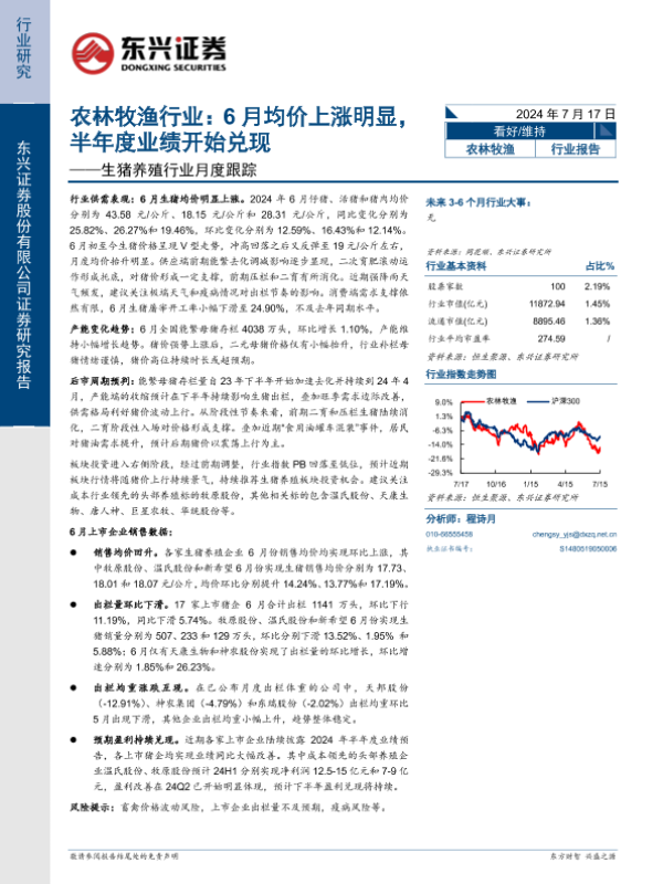 【东兴证券】【20240717】20240717-东兴证券-生猪养殖行业月度跟踪:农林牧渔行业:6月均价上涨明显,半年度业绩开始兑现-10页 行业研究