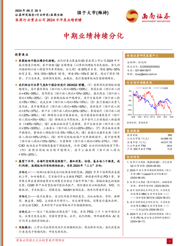 【西南证券】【20240630】医药行业重点公司2024半年度业绩前瞻-11页 行业研究