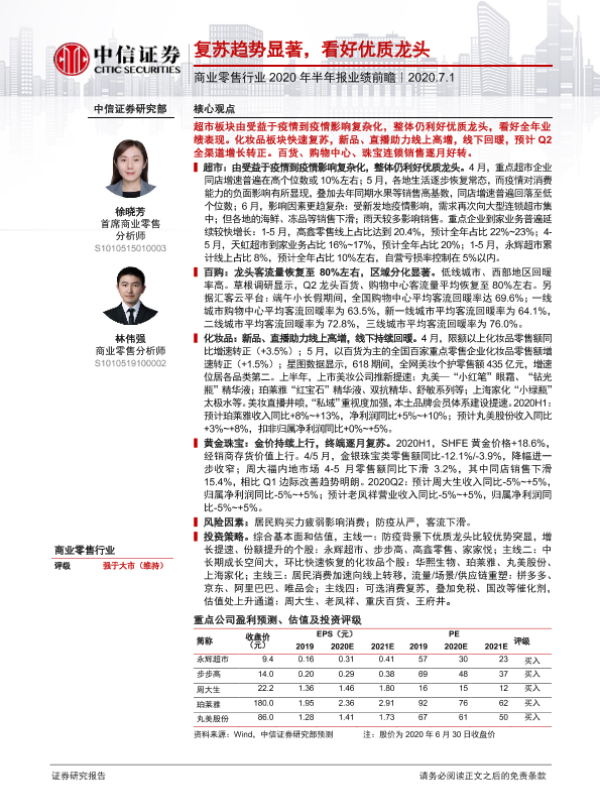 【中信证券】【20200701】商业零售行业2020年半年报业绩前瞻:复苏趋势显著,看好优质龙头-20页 行业研究