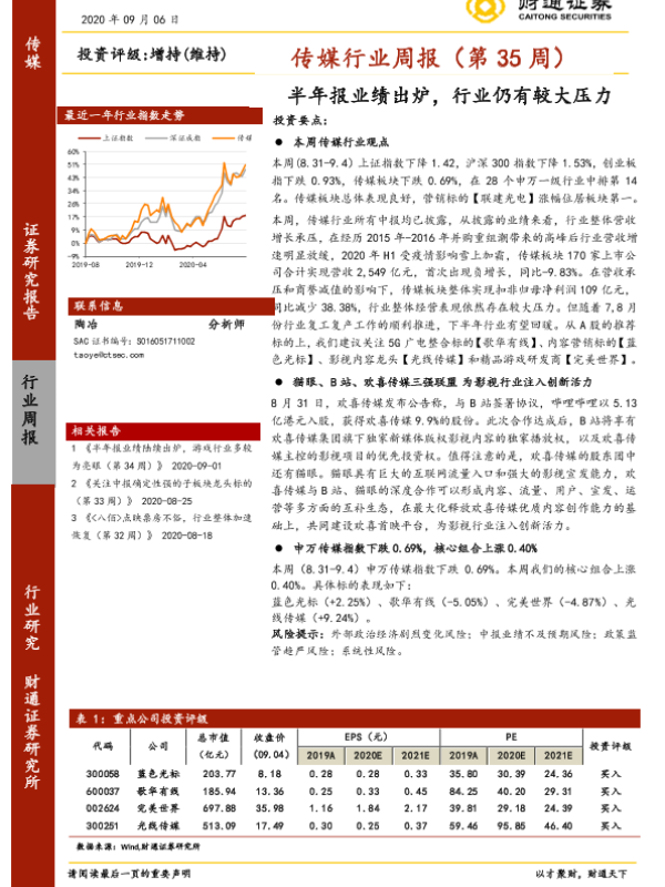 【财通证券】【20200906】20200906-财通证券-传媒行业周报(第35周):半年报业绩出炉,行业仍有较大压力-17页 行业研究
