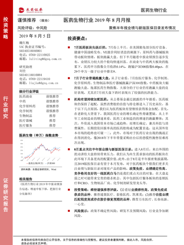【东莞证券】【20190805】医药生物行业2019年8月月报:聚焦半年报业绩与新版医保目录发布情况-15页 行业研究