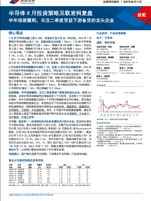 【国信证券】【20230813】半导体行业8月投资策略及联发科复盘:半年报披露期,关注二季度受益下游备货的龙头企业-26页 行业研究