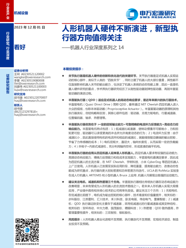 【申万宏源】【20231201】机器人行业研究报告:人形机器人硬件不断演进,新型执行器方向值得关注-33页 行业研究