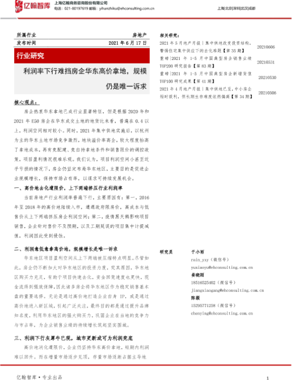 【上海亿翰商务咨询股份有限公司】【20210617】利润率下行难挡房企华东高价拿地,规模仍是唯一诉求-9页 行业研究