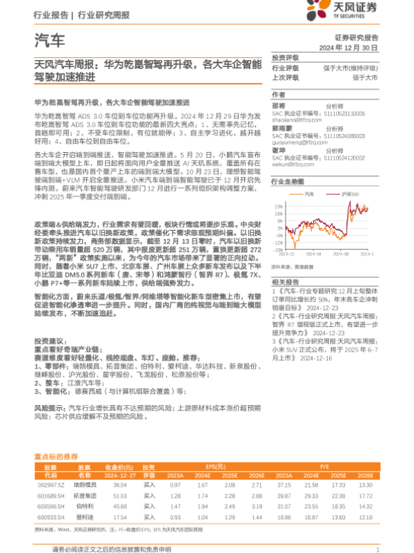 【天风证券】【20241230】20241230-天风证券-汽车行业周报:华为乾崑智驾再升级,各大车企智能驾驶加速推进-11页 行业研究