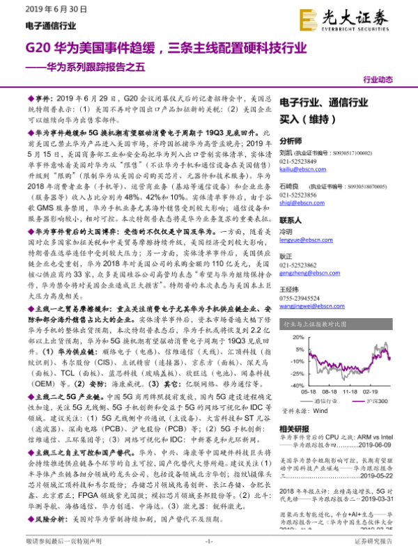 【光大证券】【20190630】G20华为美国事件趋缓,三条主线配置硬科技行业-19页 行业研究