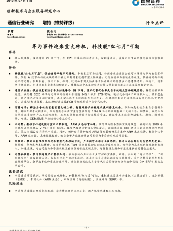 【国金证券】【20190701】通信行业研究:华为事件迎来重大转机,科技股“红七月”可期-10页 行业研究