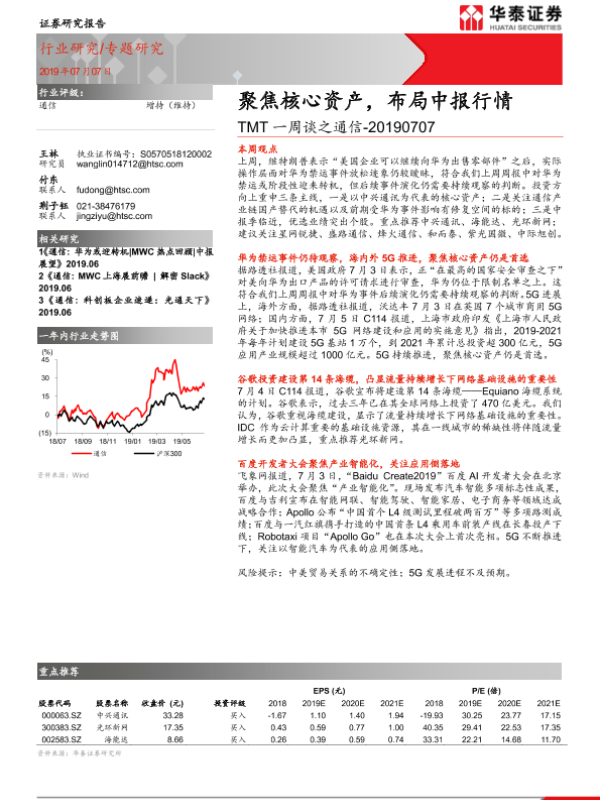 【华泰证券】【20190707】20190707-华泰证券-TMT一周谈之通信:聚焦核心资产,布局中报行情-8页 行业研究