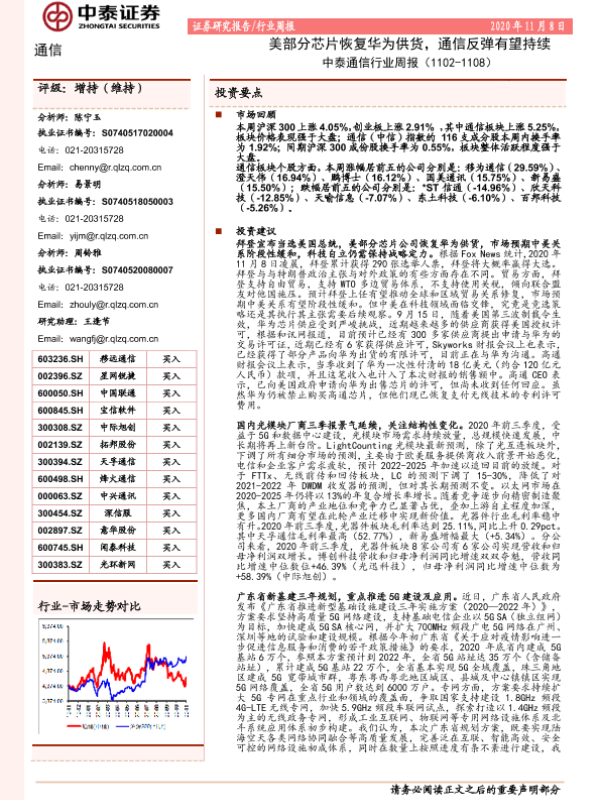 【中泰证券】【20201108】中泰通信行业周报:美部分芯片恢复华为供货,通信反弹有望持续-16页 行业研究