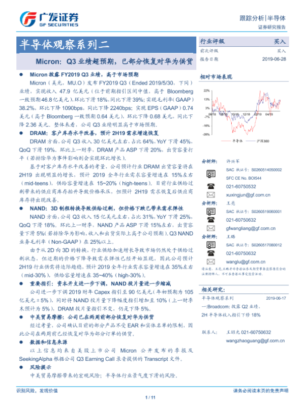 【广发证券】【20190628】Micron:Q3业绩超预期,已部分恢复对华为供货-11页 行业研究