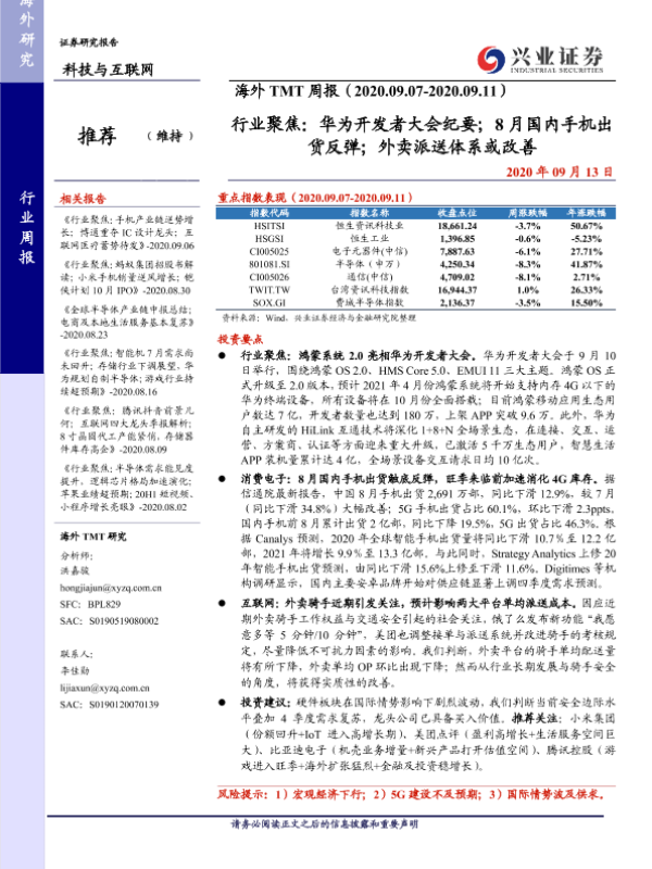 【兴业证券】【20200913】行业聚焦:华为开发者大会纪要;8月国内手机出货反弹;外卖派送体系或改善-22页 行业研究