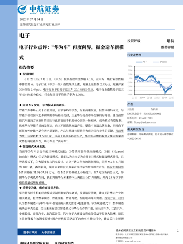 【中航证券】【20220704】电子行业点评 '华为车'再度问界,掘金造车新模式-19页 行业研究