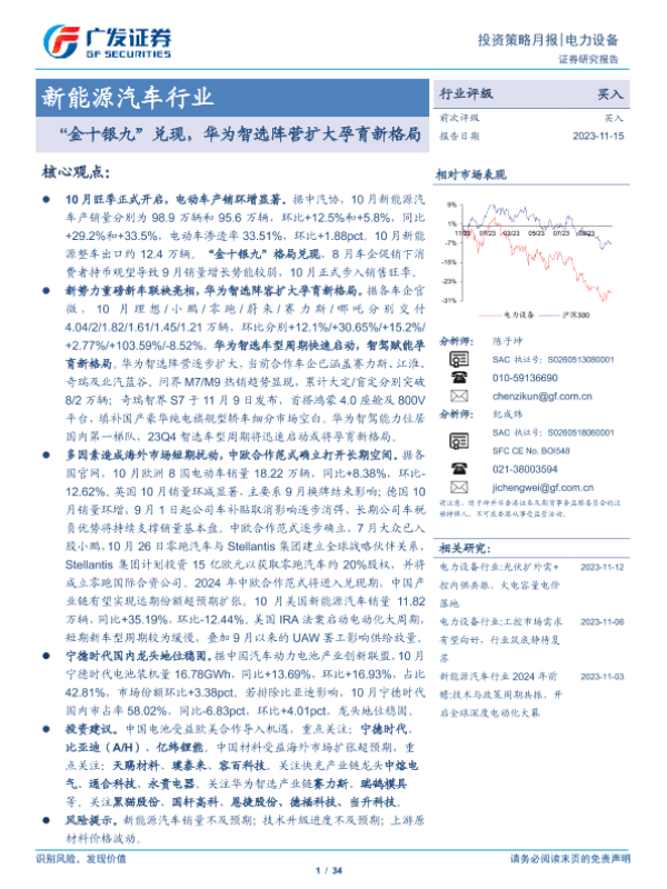 【广发证券】【20231115】20231115-广发证券-新能源汽车行业投资策略月报:“金十银九”兑现,华为智选阵营扩大孕育新格局-34页 行业研究