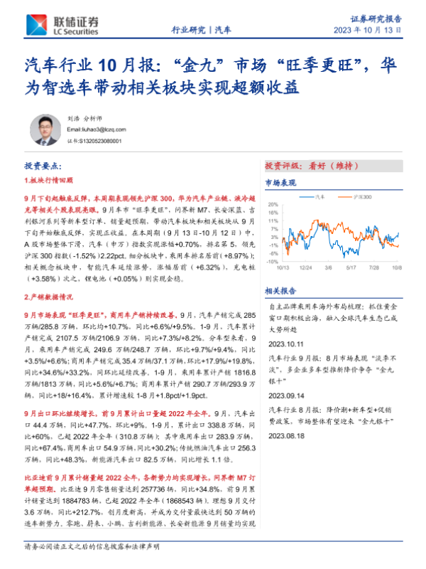 【联储证券】【20231013】汽车行业10月报:“金九”市场“旺季更旺”,华为智选车带动相关板块实现超额收益-25页 行业研究